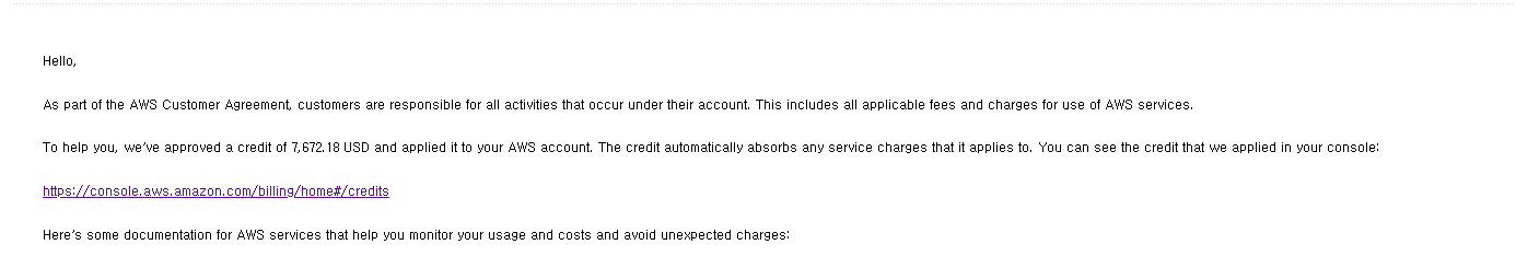 모든 절차가 끝이나면 AWS Support Team이 billing Team과의 협의를 통해 금액에 대해 논의 할것이라는 메일이 옵니다.