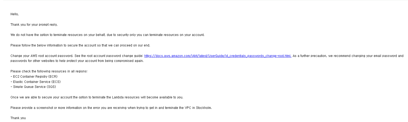 아마존으로(AWS)부터 한통의 메일이 와 있었고 계정 손상에 관한 메일이었다.